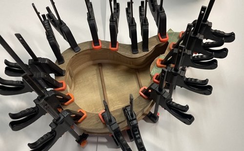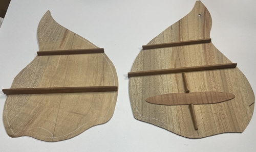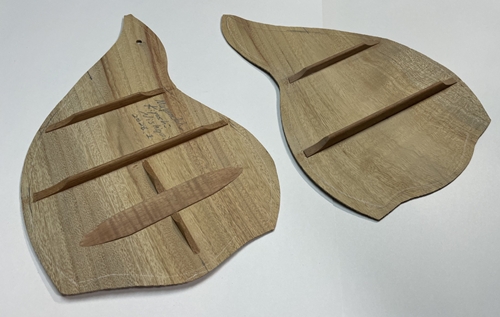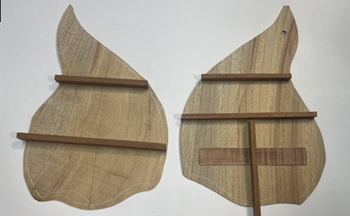 サイドが出来上がりましたなら今度はトップ、バックの番です。ブレイシング、プレート材等を用意して、整形、接着です。まずはバックから。(写真のバック材は違う物です、接着直前に気が付きまして本番ではご指定の方の材に変えてあります)