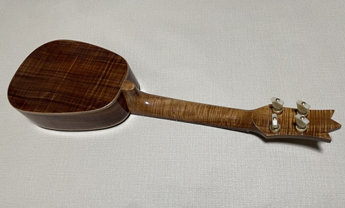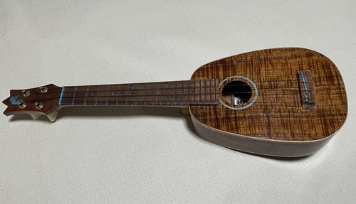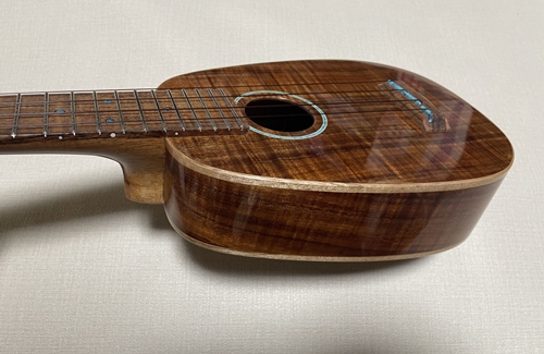 オール コア パイナップルウクレレ完成です。内部構造材以外はバインディングがサップ部分、その他はフレイムド コア、そしてインレイ、ナット、サドル、ポジションマークはトルコ石という極めてシンプルながら素材にこだわった逸品です。ヴィンテージ物に引けを取らない抜けの良さと暖かな音色でひときわ大きな存在感を示してくれます。