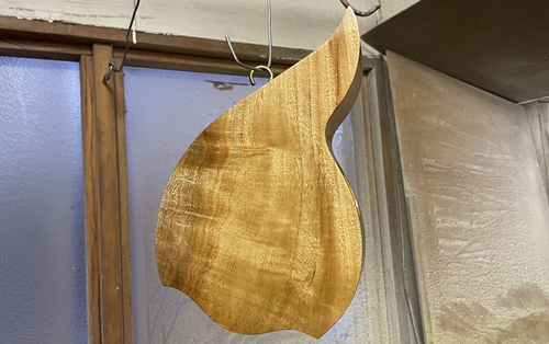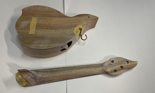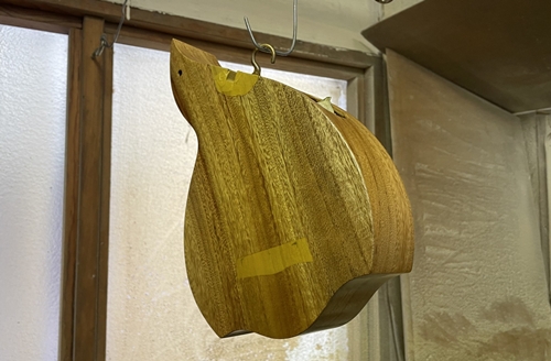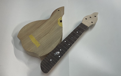 夢千鳥ネック、奇麗な形になりました。そしてボディも一緒に研磨あとはフィンガーボード面、接着面をマスキングして塗装準備です。