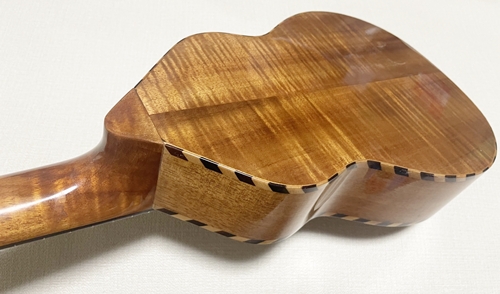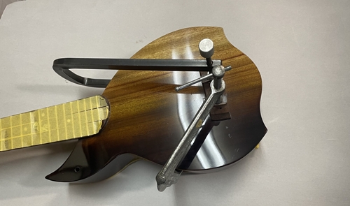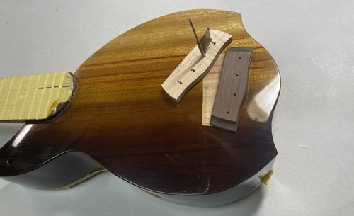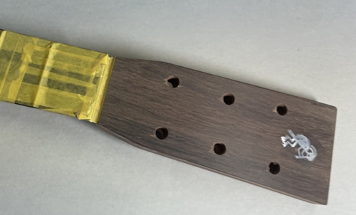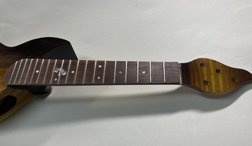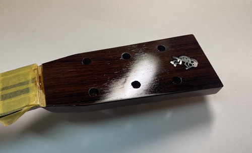 このモデルの最大の難関がネックのヒール部分、ボディとのジョイント面が奇麗につながるように削るのがとても面倒なのです。しかもコアは非常に硬くエッジが欠け易いのです。