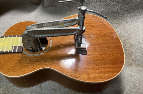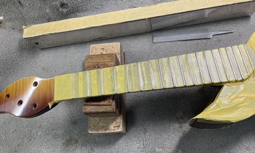 夢千鳥のフレットすり合わせです。完成が近づいてきました。マホガニーコンサートCはネックジョイントです。