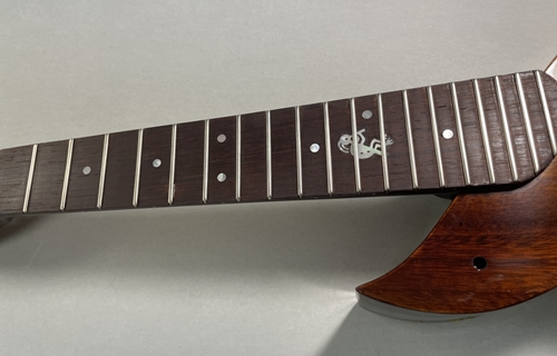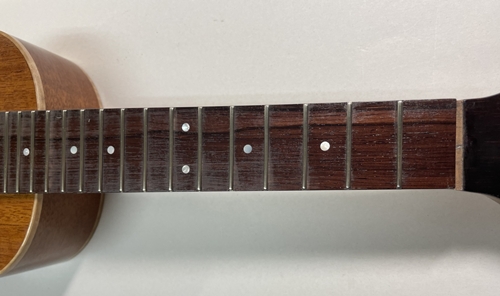 ヴィンテージ マホガニーAはフレット水平出し完了、フィンガーボードのマダガスカル ローズウッドの木目が奇麗なのですが写真ではあまりよくわかりませんね。