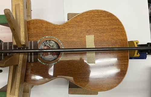 マホガニーコンサートCはボディ空研ぎ完了研磨準備です。