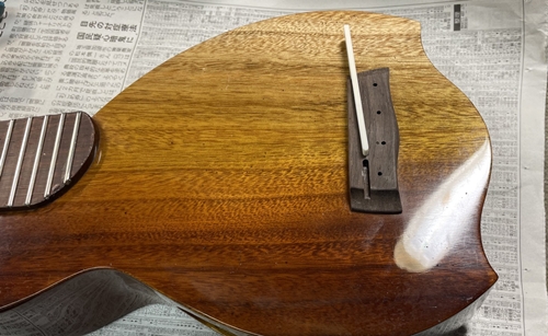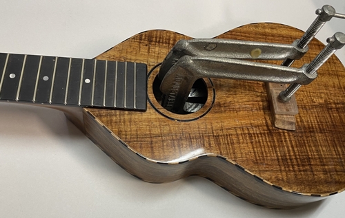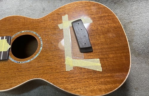 マホガニーコンサートAにはブリッジ(ハカランダ材)を作って接着です。