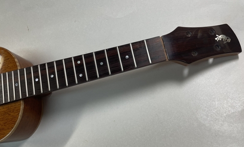 コンサートBはフレット水平出し、こちらもマダガスカルローズウッドのフィンガーボード、ヘッドべニアの木目が美しいです。(写真ではよくわからないのが残念です)