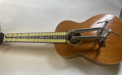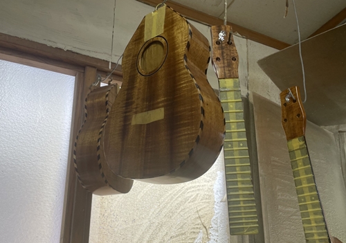 マホガニーコンサートCはフレットの水平出しを完了、ブリッジ(ハカランダ材)を接着中。塗装ブースには別のワイゼンロープ2本が待機中、らっかーも大分乗って来ました。