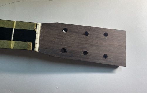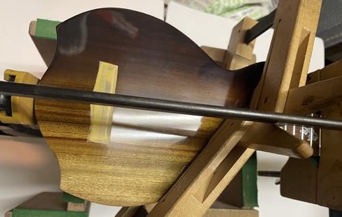ボディとネックの接着です。もう一つは以前切り出したココペリ用のヘッドの表板の完了です。
