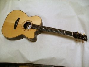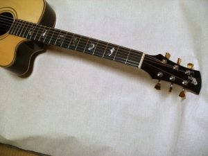 ハカランダボディも塗装は最終段階です。エイジド・スプルースとラッカーのお陰で少し焼けた感じが