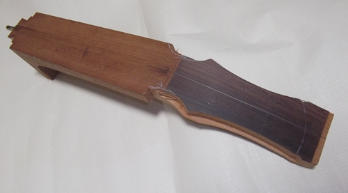 ヘッドを整形したならペグ穴開け準備です。ヘッド裏を綺麗に平らにしなければいけません。